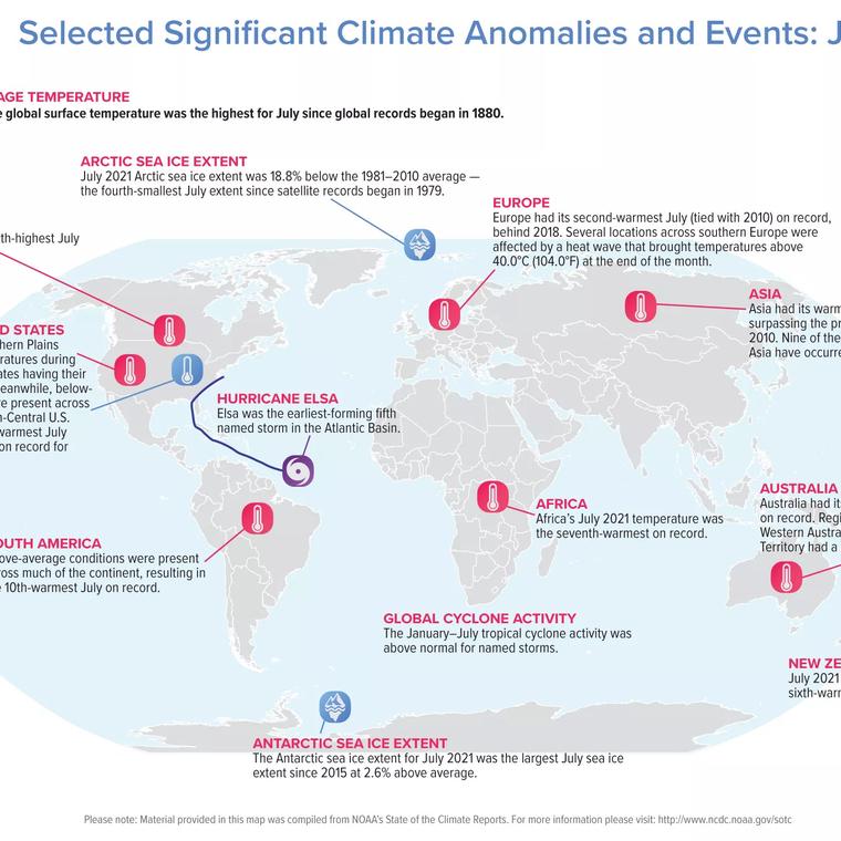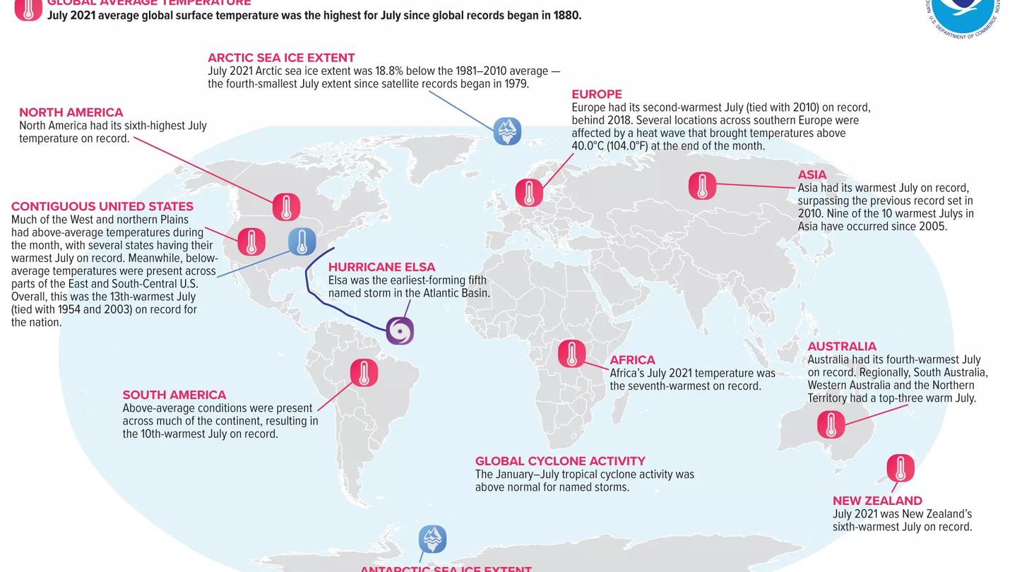 El administrador de la NOAA, el doctor Rick Spinard, declaró: “Julio suele ser el mes más cálido del año, pero julio de 2021 se superó a sí mismo como el julio y el mes más calurosos jamás registrado. Este nuevo récord se suma a la inquietante y perturbadora trayectoria que el cambio climático ha marcado para el planeta.”