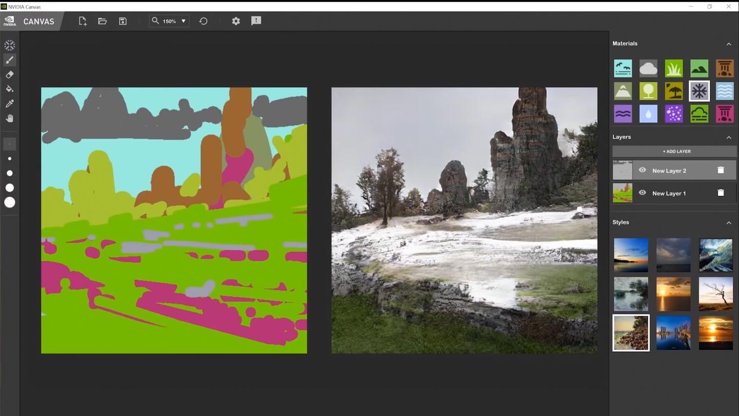 La aplicación Canvas se centra en la creación de paisajes naturales. Sin embargo, Nvidia afirma que las redes subyacentes pueden generar otras características del paisaje, como personas, carreteras y edificios.