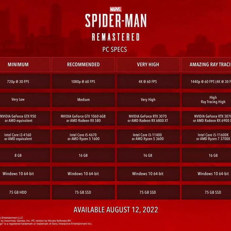 Marvel’s Spider-Man es el próximo título exclusivo de PlayStation que llegará a PC el mes que viene. El desarrollador Nixxes ha dotado al juego de muchas de las mismas características técnicas y de accesibilidad que vimos en las adaptaciones a PC de Horizon Zero Dawn y God of War. Los requisitos del sistema también son similares, por lo que los PC de juegos modestos deberían ser capaces de manejarlo a 1080p, pero Sony recomienda las tarjetas de rendimiento más recientes para 4K.