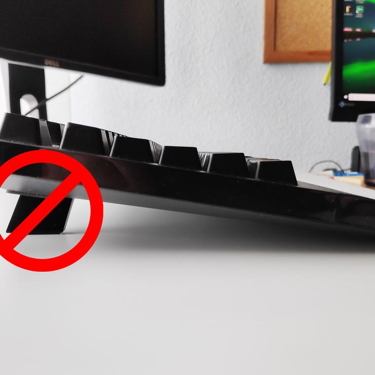 Posición neutra del teclado: si el teclado está más bajo que el escritorio coloca el teclado sí o sí en posición neutra, nunca con inclinación positiva. O, mejor aún, utiliza un teclado con inclinación negativa, ayudará a que tus muñecas estén en una posición correcta.