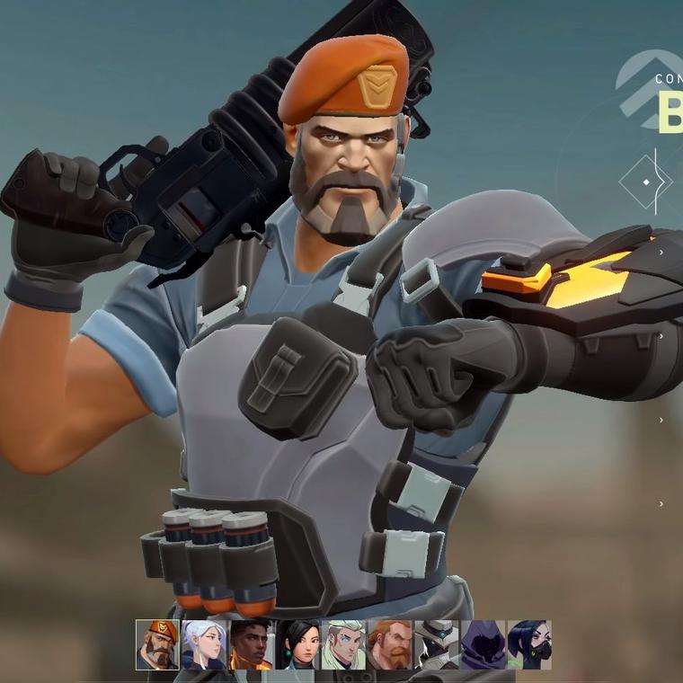 Brimstone es un agente muy táctico. Su habilidad de colocar tres granadas de humo repartidas por el mapa otorgan al equipo un mayor control del mapa. También cuenta con un lanzagranadas y un pequeño faro o baliza que le da al equipo mayor velocidad de disparo.