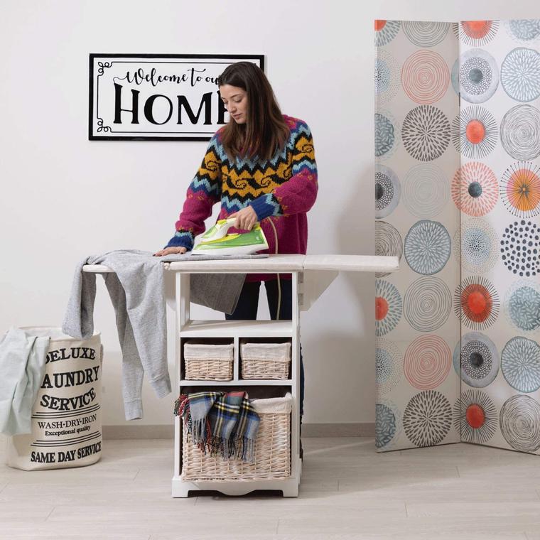 Cuenta con estantes en los cuales poner cajoneras de mimbre o de tela para una mejor organización, aunque lo más destacado de su diseño es que incorpora una rejilla porta plancha con alfombrilla de goma altamente resistente al calor y también un muletón y funda incluidos. Asimismo, posee cuatro ruedas.