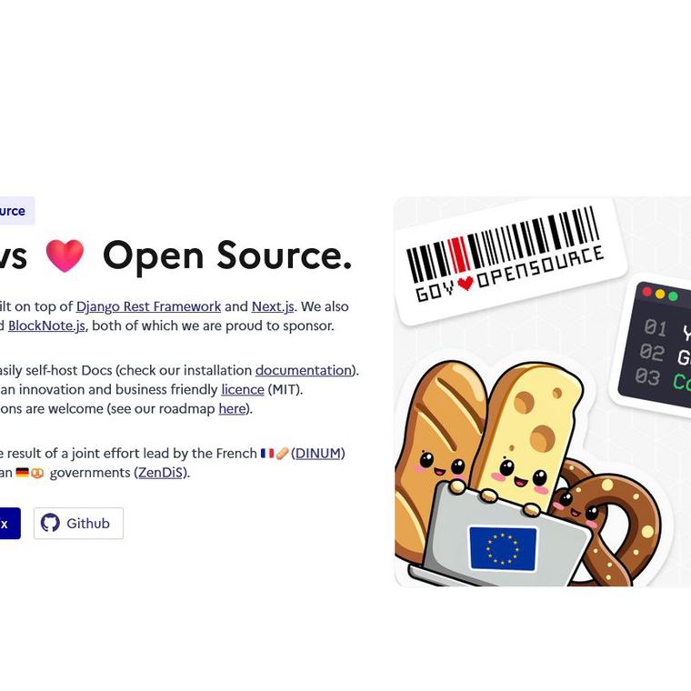 Docs se publica bajo la permisiva licencia MIT, que permite tanto su uso comercial como privado. Aunque el proyecto es principalmente una iniciativa del sector público dirigida por las organizaciones gubernamentales DINUM y ZenDiS, se anima a las entidades privadas a utilizar, contribuir o incluso comercializar el código abierto disponible en GitHub.
