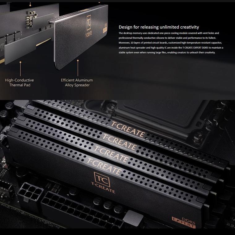 Diseñada para procesar tareas creativas, las memorias de sobremesa T-CREATE EXPERT DDR5 adoptan un diseño de refrigeración poroso de una sola pieza y silicona térmica de alta conductividad para la disipación del calor.