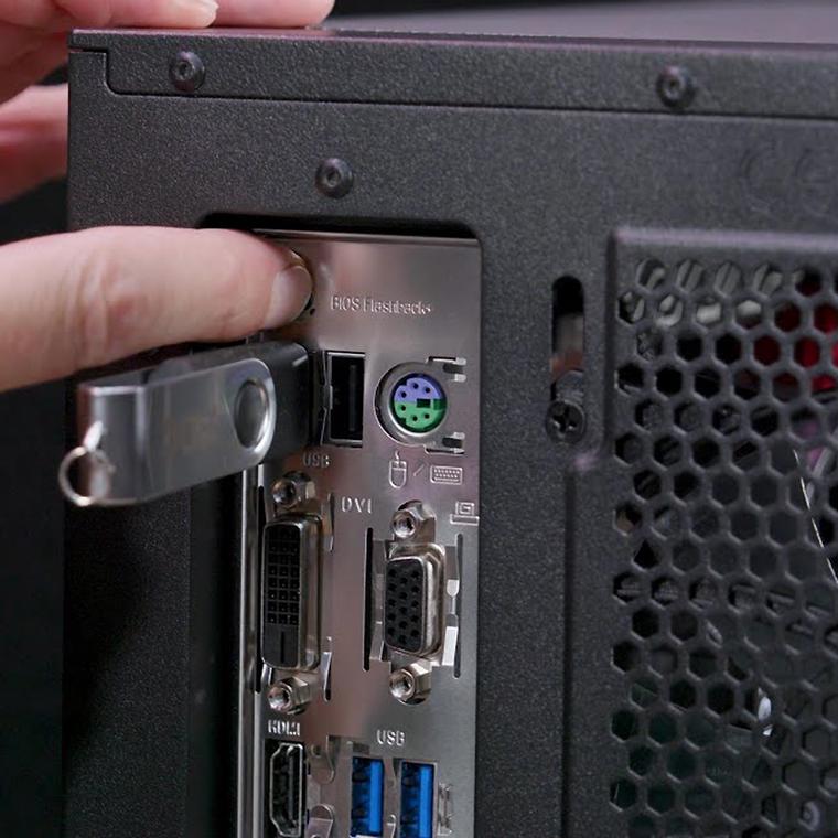 - Conecta la memoria USB a la placa MSI en el Puerto BIOS Flash (debe estar marcado). La placa debe estar conectada a la fuente de alimentación, aunque no es necesario que tenga CPU ni memoria RAM