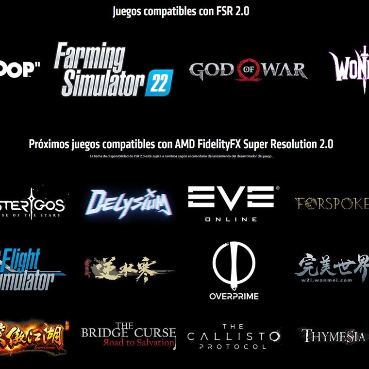 El juego más importante que va a ser compatible con FSR 2.0 es Forspoken, de Square Enix, que se lanzará en octubre. Otros juegos son Asterigos: Curse of the Stars, el juego de blockchain Delysium, Overprime, NiShuiHan, Perfect World Remake, Swordsman Remake y Unknown 9: Awakening. Otros juegos que ya utilizan FSR 1.0 y que, en teoría, podrían ver pronto el soporte 2.0 son Resident Evil Village, God of War, Far Cry 6, Quake II RTX, Death Stranding, Cyberpunk 2077 y No Man’s Sky, entre otros.