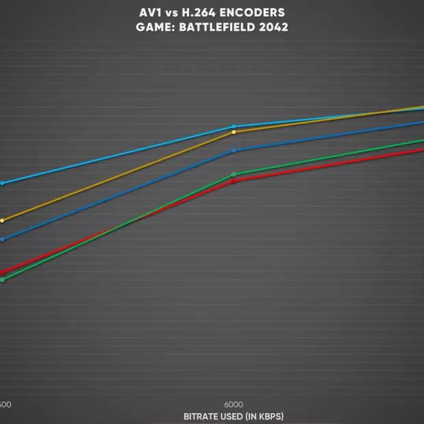 Al transmitir juegos como Halo Infinite y Battlefield 2042, el codificador AV1 de Intel produjo un vídeo significativamente más limpio que los codificadores H.264 como Nvidia NVENC, AMF de AMD y QSV de Intel, incluso a tasas de bits más bajas. El codificador Intel AV1 a 3,5 Mbps parece superar al de AMD y Nvidia a 6 Mbps. La ventaja de AV1 se reduce a velocidades de bits superiores, pero a 6 Mbps sigue superando los resultados de los otros proveedores de GPU a 8 Mbps.