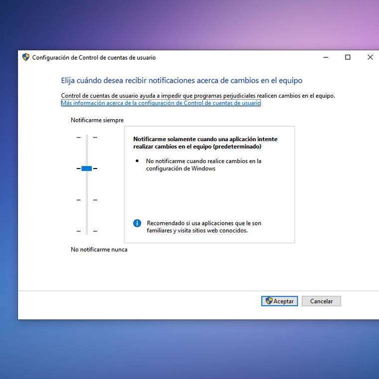 - Notificar siempre: Windows te pide que verifiques a través de UAC cada vez que una aplicación intenta instalar un software o hacer cambios en tu PC. También pide verificación cuando haces cambios en la configuración de Windows.