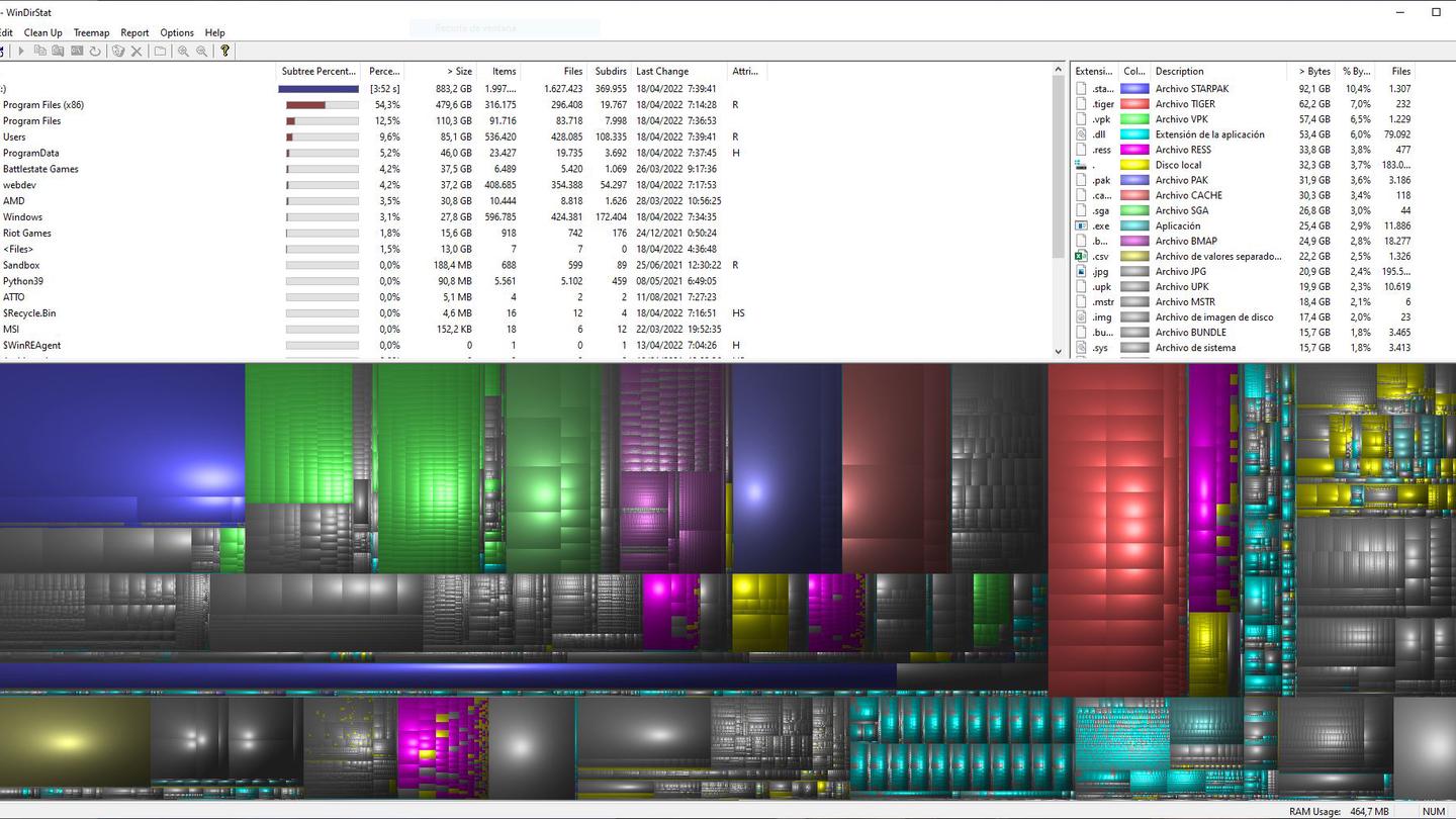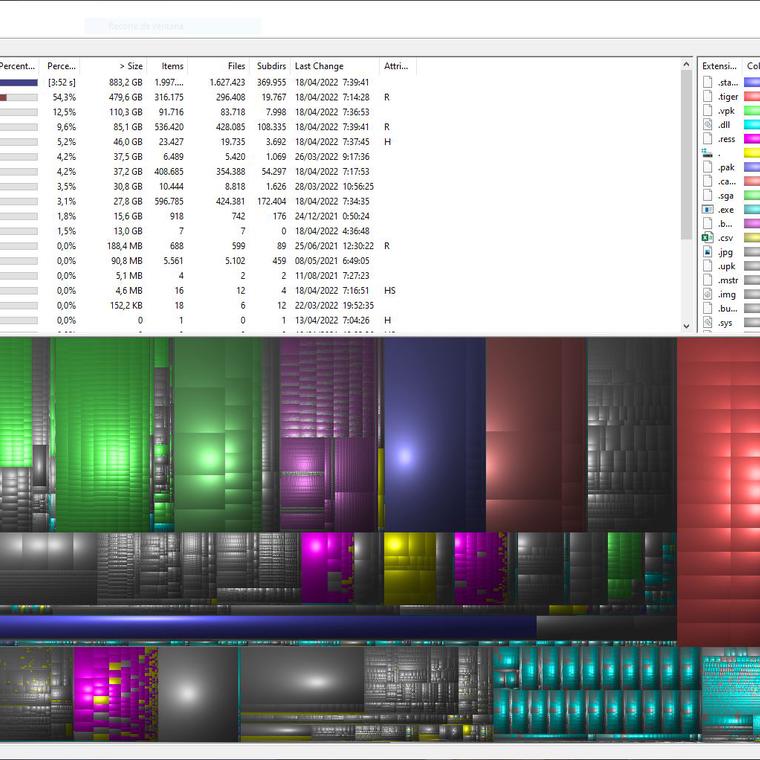 - A la derecha, hay una lista de extensiones de archivos que muestra estadísticas sobre los tipos de archivos que utilizan más espacio. También sirve como leyenda, explicando los colores que aparecen en la parte inferior de la ventana.
