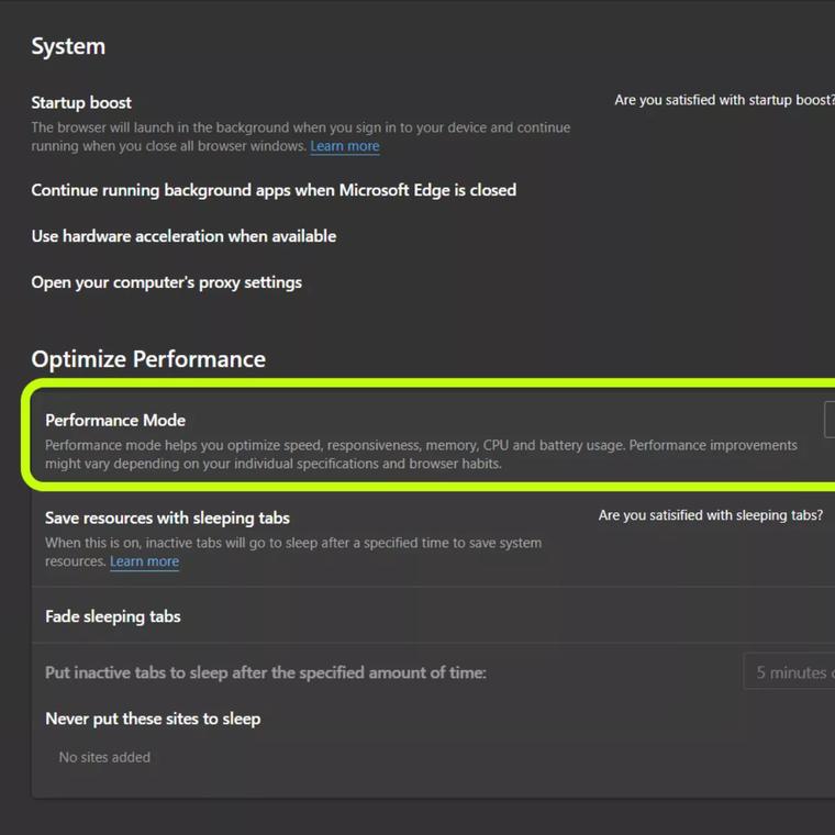La nueva función está disponible para la versión de Edge Canary, aunque se espera que llegue pronto a la versión principal. Para activarla sólo tienes que ir al menú de Configuración de Edge, hacer clic en la pestaña Sistema y buscar en la sección “Optimizar el rendimiento”.