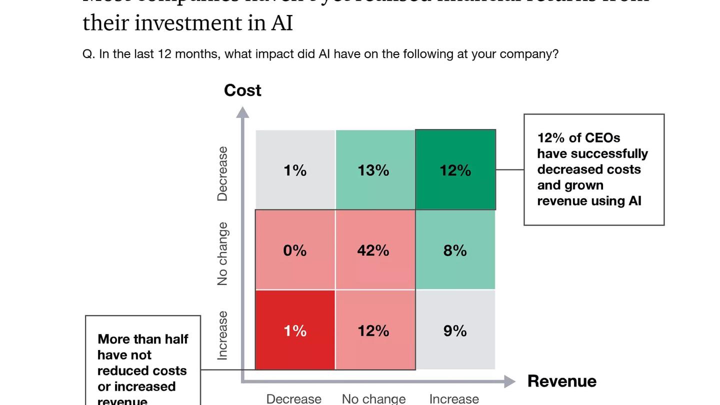 - Falta de beneficios: Según la última encuesta global de PwC, que consultó a 4,454 CEOs en 95 países, el 56% de los ejecutivos afirma no haber visto ningún beneficio financiero significativo de la adopción de la IA hasta la fecha.