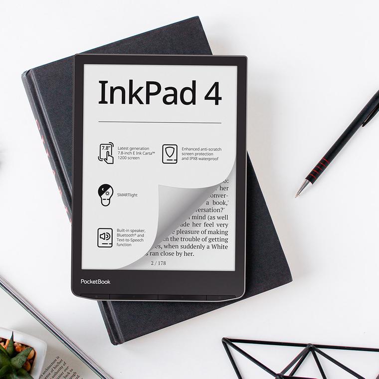 El nuevo PocketBook InkPad 4 contará con pantalla de 7,8 pulgadas de última generación E Ink Carta™ 1200, altavoz integrado, Bluetooth® y resistencia al agua IPX8. Además, mantiene funcionalidades de modelos anteriores como función SMARTlight, compatibilidad con audiolibros y tecnología Text-to-Speech.