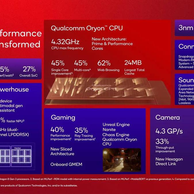 Los dos núcleos principales de la CPU de Oryon alcanzan velocidades máximas de 4,32 GHz -supuestamente las más rápidas del sector- y seis nuevos núcleos de rendimiento que alcanzan velocidades máximas de 3,53 GHz cada uno. El último chipset insignia de Qualcomm también prescinde de los núcleos de eficiencia, dos de los cuales aparecen en el Snapdragon 8 Gen 3.