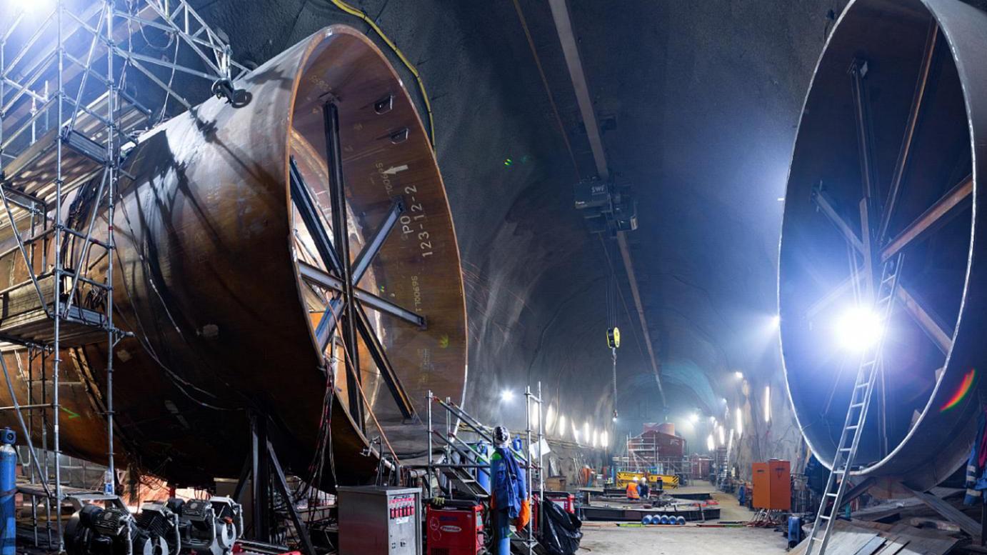 Suiza ha necesitado 2.000 millones de euros y 14 años, pero la “batería de agua” subterránea del país ya está terminada y operativa. El proyecto ha tardado tanto en completarse en parte porque los trabajadores han tenido que hacer un túnel a través de más de casi 20 km de los Alpes suizos.