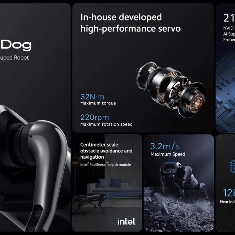 El motor de CyberDog es el “superordenador de inteligencia artificial más pequeño del mundo”, el Jetson Xavier NX de Nvidia. El robot está cubierto de 11 sensores y cámaras, entre los que se incluyen sensores táctiles y ultrasónicos, un módulo GPS, una lente de ojo de pez ultra gran angular y la cámara RealSense D450 de Intel para detectar la profundidad, todo lo cual le ayuda a sortear los obstáculos mientras sigue a su dueño.